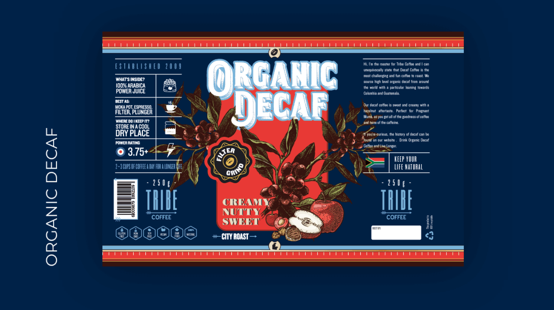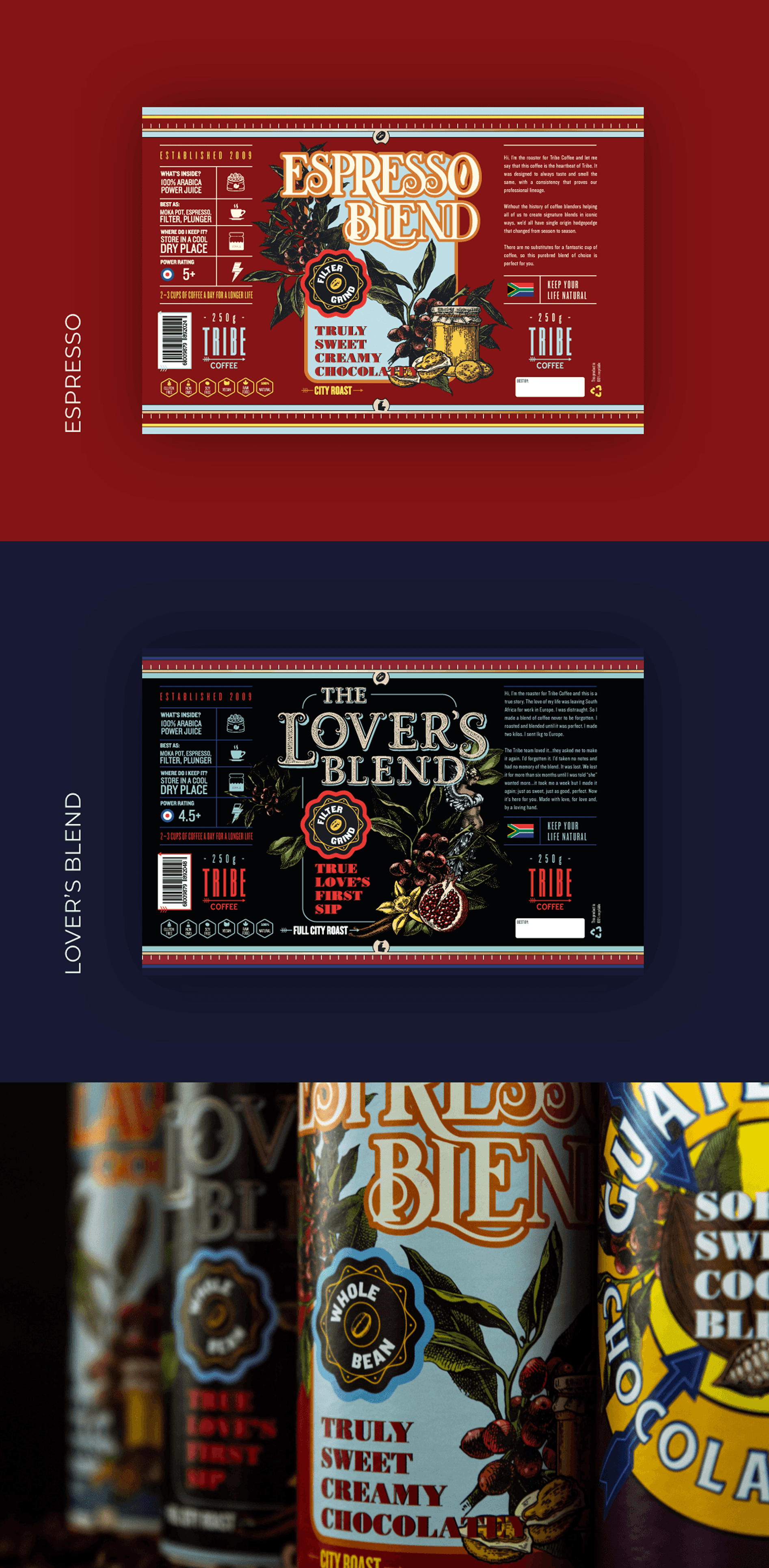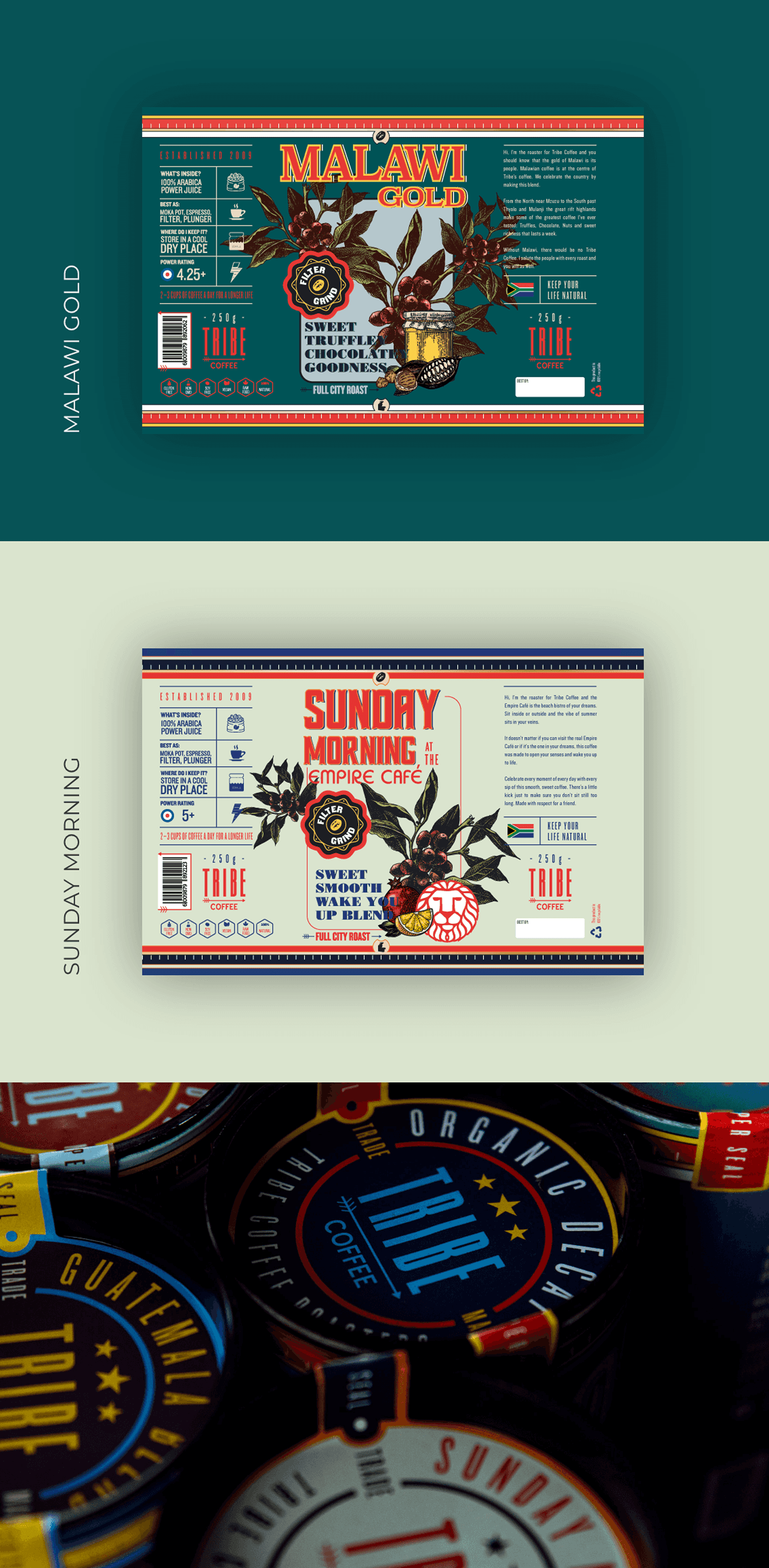 Tribe is a small, independent coffee brand based in Cape Town with a loyal following and a clear point of view. The brief was to design packaging that stood completely apart from the standard foil bag format everyone else in the market uses. Each flavour needed its own distinct identity while holding together as a family. The solution drew inspiration from vintage fruit posters of the 1950s — bold, illustrative, and full of character. The result was packaging designed to be a talking point on the shelf, not just a container.
